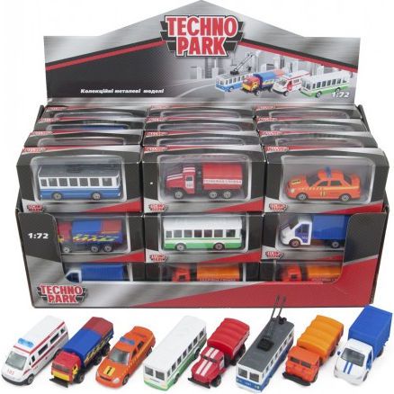 В диспенсере представлены 36 масштабированных металлических моделей автомобилей восьми видов, которые станут прекрасными подарками для маленьких автолюбителей .Среди моделей - модели троллейбуса, автобуса, машины скорой помощи и пожарной службы.Рекомендовано для детей возрастом 3 лет.